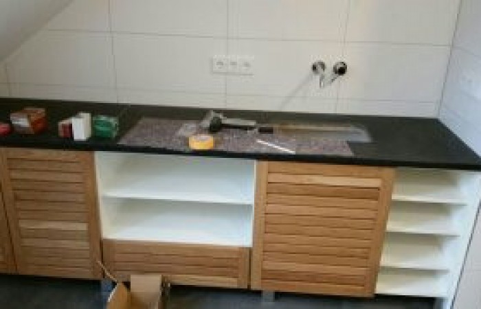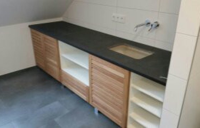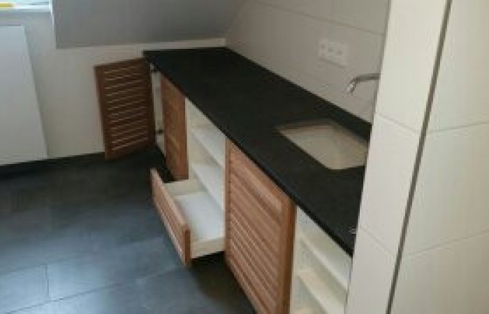 Waschtisch mit Eiche Lamellentüren und Granitabdeckplatte 3